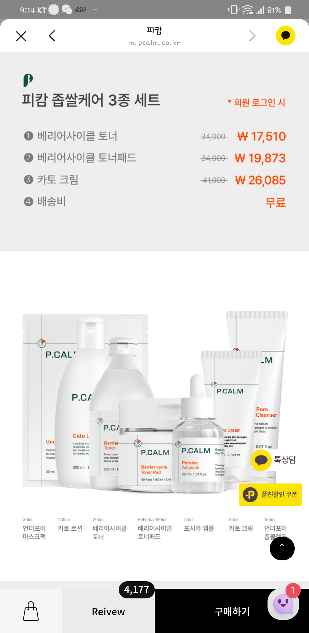 피캄 홈에는 좁쌀 케어 3종 세트와 모공 케어 3종 세트도