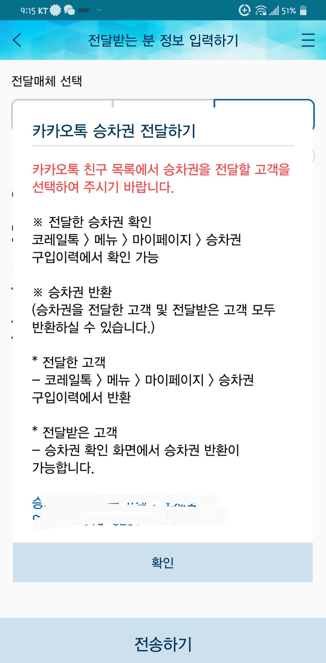 승차권 전달로 들어가서 카카오톡으로 보낼지 문자로